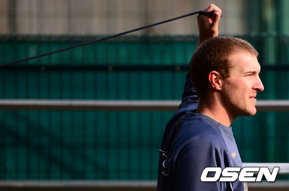 9일 오후 서울 잠실야구장에서 열린 2013 한국야쿠르트 세븐프로야구 LG 트윈스와 NC 다이노스의 경기, 경기에 앞서 NC 찰리가 몸을 풀고 있다.