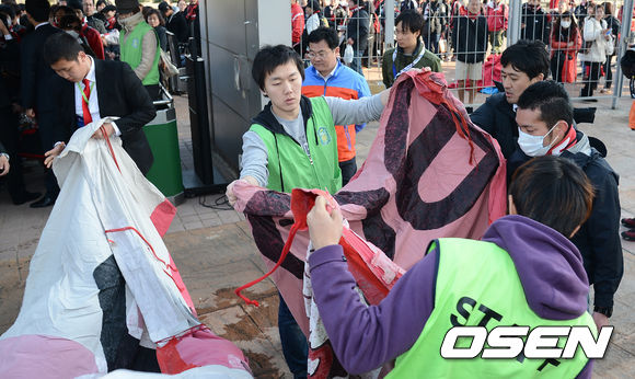 9일 오후 전주 월드컵경기장에서 열리는 2013 아시아축구연맹(AFC) 조별리그 4차전 전북 현대와 우라와 레즈의 경기에 앞서 전북 관계자 및 경호원들이 우라와 레즈 서포터즈들의 소지품 검사를 하고 있다.
