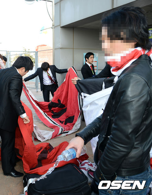 9일 오후 전주 월드컵경기장에서 열리는 2013 아시아축구연맹(AFC) 조별리그 4차전 전북 현대와 우라와 레즈의 경기에 앞서 전북 관계자 및 경호원들이 우라와 레즈 서포터즈들의 소지품 검사를 하고 있다.