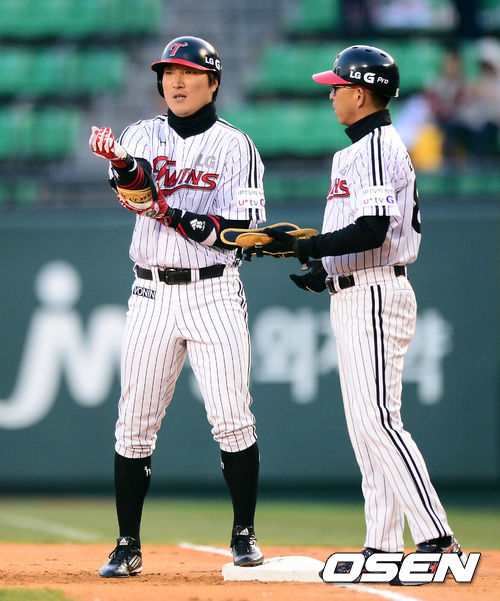 9일 오후 서울 잠실야구장에서 열린 2013 한국야쿠르트 세븐프로야구 LG 트윈스와 NC 다이노스의 경기, 1회말 무사 3루에서 LG 이진영이 좌전 적시타를 치고 타임을 외치고 있다.