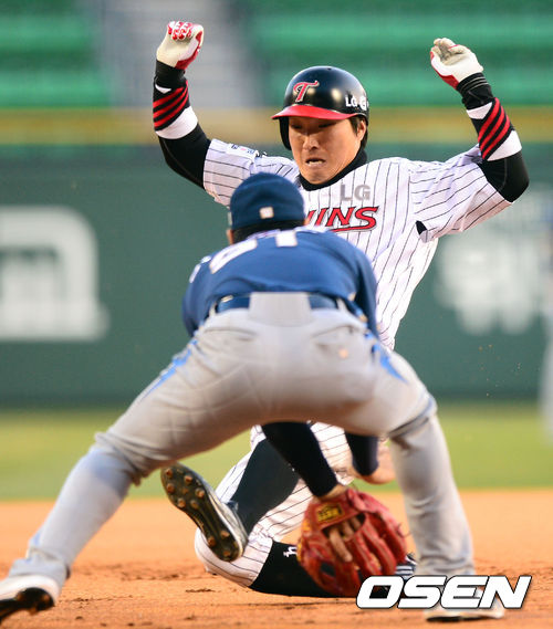 9일 오후 서울 잠실야구장에서 열린 2013 한국야쿠르트 세븐프로야구 LG 트윈스와 NC 다이노스의 경기, 1회말 무사 1루에서 LG 박용택의 내야땅볼 때 1주자 이진영이 3루까지 쇄도하고 있다.