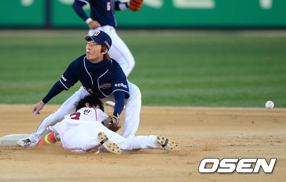 9일 오후 광주 무등경기장에서 '2013 한국야쿠르트 세븐 프로야구' KIA 타이거즈 대 두산 베어스의 경기가 열렸다. 1회말 KIA 공격 1사 1루 상황 주자 김선빈이 2루 도루에 성공하며 두산 2루수 고영민과 부딪히고 있다.