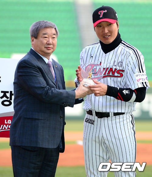 9일 오후 서울 잠실야구장에서 열린 2013 한국야쿠르트 세븐프로야구 LG 트윈스와 NC 다이노스의 경기, 경기에 앞서 LG 이진영이 1,500경기 출장 및 안타 달성 시상식을 갖고 있다.