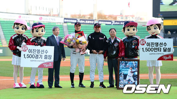 9일 오후 서울 잠실야구장에서 열린 2013 한국야쿠르트 세븐프로야구 LG 트윈스와 NC 다이노스의 경기, 경기에 앞서 LG 이진영이 1,500경기 출장 및 안타 달성 시상식을 갖고 기념촬영을 하고 있다.