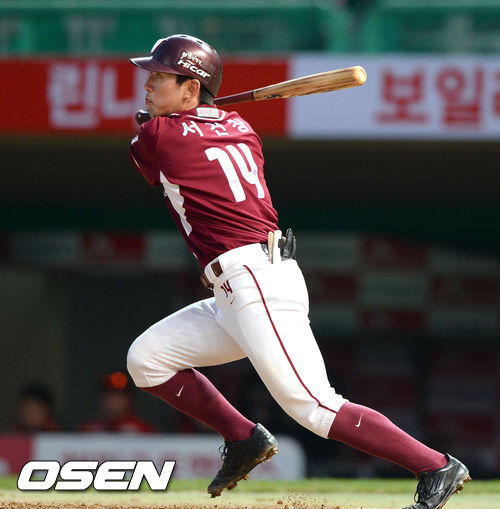 9일 오후 인천 문학구장에서 열린 '2013 한국야쿠르트 세븐 프로야구' SK 와이번스와 넥센 히어로즈의 경기 3회초 1사 넥센 서건창이 안타를 날리고 있다. 서건창은 전타석에서도 안타를 기록했다.