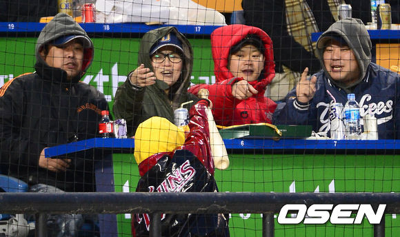 9일 오후 서울 잠실야구장에서 열린 2013 한국야쿠르트 세븐프로야구 LG 트윈스와 NC 다이노스의 경기, 3회초 1사에서 NC 김태군이 스윙을 하며 놓친 배트가 관중석 그물에 걸리자 어린이 팬이 배트를 그물에서 빼고 있다.