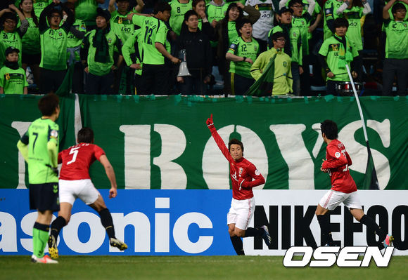 9일 오후 전주 월드컵경기장에서 열린 2013 아시아축구연맹(AFC) 조별리그 4차전 전북 현대와 우라와 레즈의 경기 전반 우라와 우메사키가 추가골을 넣고 기뻐하고 있다.