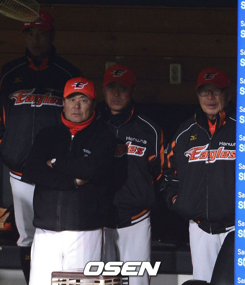 9일 오후 대구구장에서 열린 '2013 한국야쿠르트 세븐 프로야구' 삼성 라이온즈와 한화이글스 경기 3회초 한화 김응룡 감독이 0-5로 지고있는 상황에서 코치진들과 경기를 관전하고 있다.