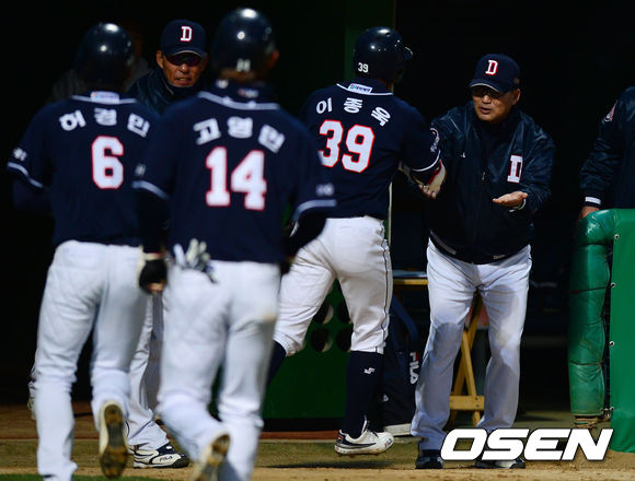 9일 오후 광주 무등경기장에서 '2013 한국야쿠르트 세븐 프로야구' KIA 타이거즈 대 두산 베어스의 경기가 열렸다. 2회초 두산 공격 1사 1, 2루 상황 1번 이종욱이 역전 우월 3점포를 날리고 김진욱 감독과 인사를 나누고 있다.