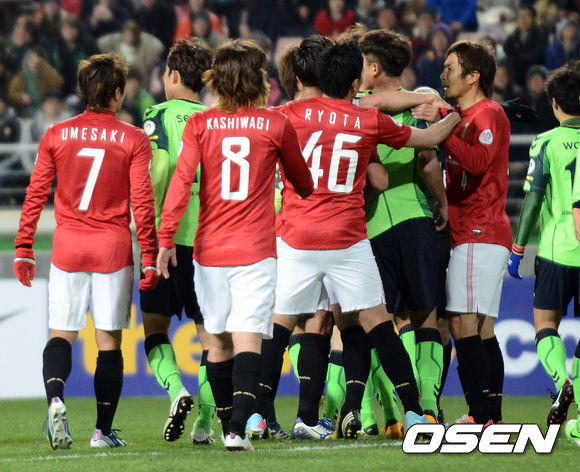 9일 오후 전주 월드컵경기장에서 열린 2013 아시아축구연맹(AFC) 조별리그 4차전 전북 현대와 우라와 레즈의 경기 전반 전북 박원재와 우라와 케이타가 몸싸움을 벌여 경기가 중단되고 선수들이 신경전을 벌이고 있다.