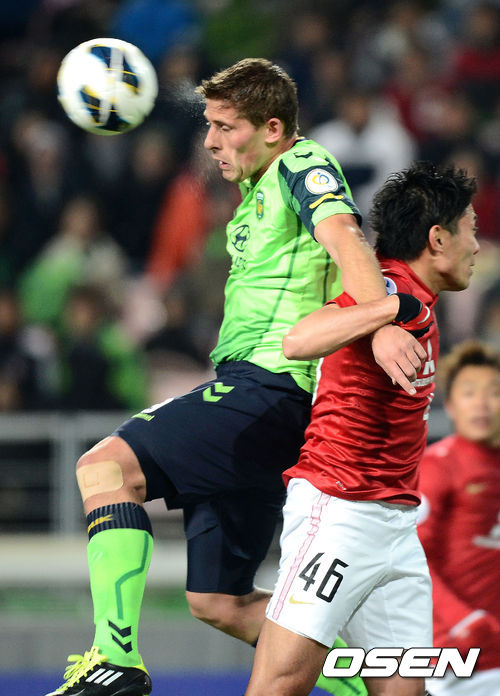 9일 오후 전주 월드컵경기장에서 열린 2013 아시아축구연맹(AFC) 조별리그 4차전 전북 현대와 우라와 레즈의 경기 전반 전북 케빈이 우라와 선수와 헤딩경합을 벌이고 있다.