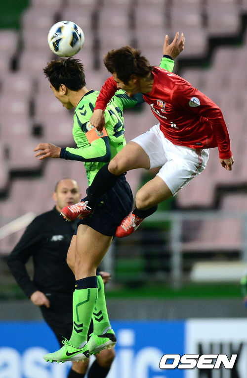 9일 오후 전주 월드컵경기장에서 열린 2013 아시아축구연맹(AFC) 조별리그 4차전 전북 현대와 우라와 레즈의 경기 전반 전북 이동국이 헤딩경합을 벌이고 있다.