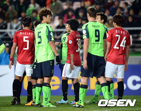 9일 오후 전주 월드컵경기장에서 열린 2013 아시아축구연맹(AFC) 조별리그 4차전 전북 현대와 우라와 레즈의 경기 전반 전북 박원재와 우라와 케이타가 몸싸움을 벌여 경기가 중단되고 선수들이 신경전을 벌이고 있다.