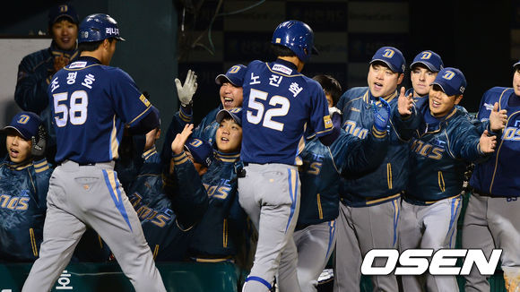 9일 오후 서울 잠실야구장에서 열린 2013 한국야쿠르트 세븐프로야구 LG 트윈스와 NC 다이노스의 경기, 4회초 1사 1,3루에서 NC 노진혁의 역전 희생플라이 때 홈을 밟은 3루주자 조평호와 타자 노진혁이 덕아웃에서 동료들의 축하를 받고 있다.