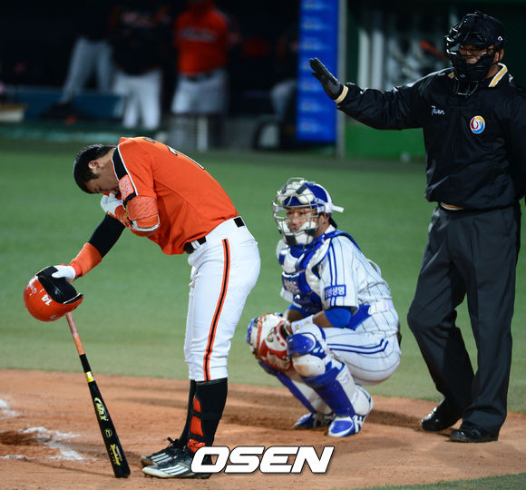 9일 오후 대구구장에서 열린 '2013 한국야쿠르트 세븐 프로야구' 삼성 라이온즈와 한화이글스 경기 5회초 선두타자 한화 이대수가 강한바람에 눈에 먼지가 들어가자 타임을 요청하고 먼지를 닦아내고 있다.