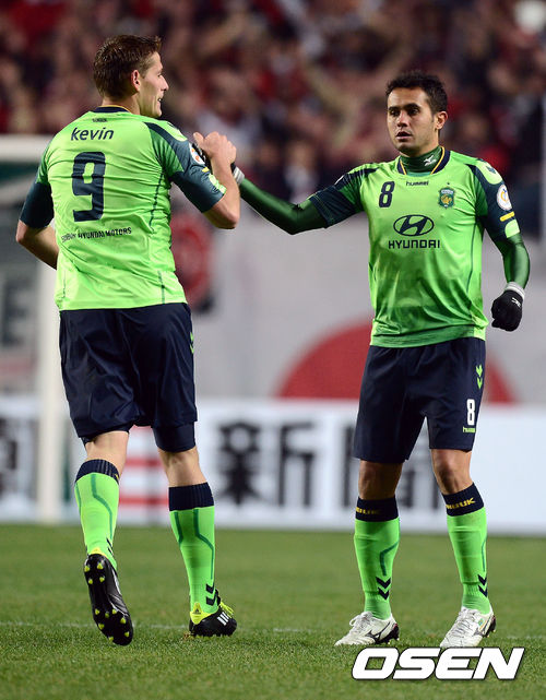 9일 오후 전주 월드컵경기장에서 열린 2013 아시아축구연맹(AFC) 조별리그 4차전 전북 현대와 우라와 레즈의 경기 후반 에닝요가 골을 넣고 케빈과 기뻐하고 있다.