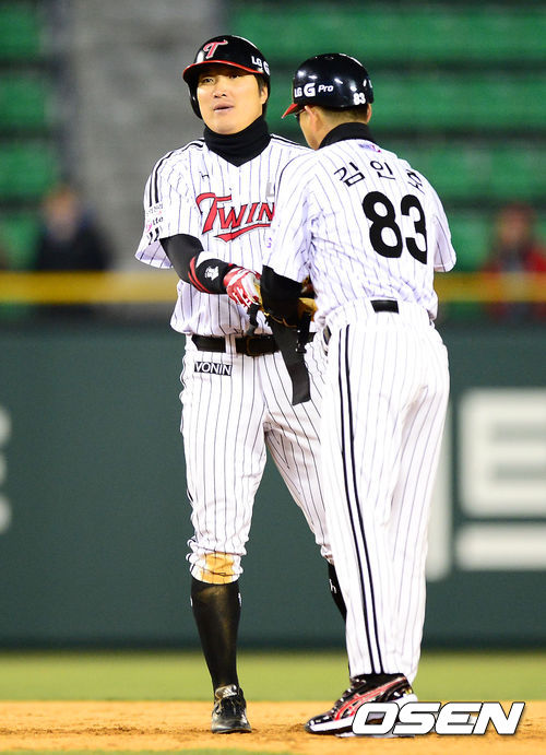 9일 오후 서울 잠실야구장에서 열린 2013 한국야쿠르트 세븐프로야구 LG 트윈스와 NC 다이노스의 경기, 4회말 1사 1,2루에서 LG 이진영이 좌전 적시타를 치고 김인호 코치와 하이파이브를 하고 있다.
