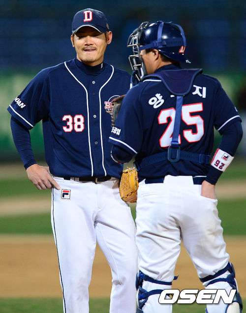 9일 오후 광주 무등경기장에서 '2013 한국야쿠르트 세븐 프로야구' KIA 타이거즈 대 두산 베어스의 경기가 열렸다. 4회말 KIA 공격 2사 1, 3루 상황 두산 선발 노경은이 포수 양의지와 대화를 나누고 있다.