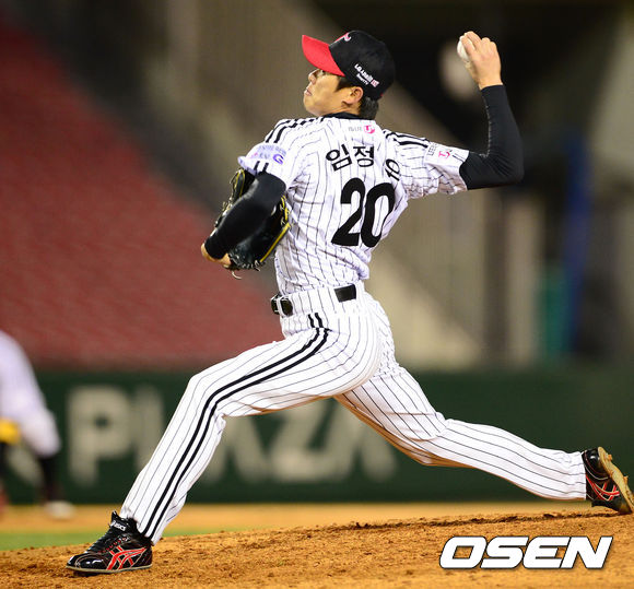 9일 오후 서울 잠실야구장에서 열린 2013 한국야쿠르트 세븐프로야구 LG 트윈스와 NC 다이노스의 경기, 5회초 LG 임정우가 힘차게 공을 던지고 있다.