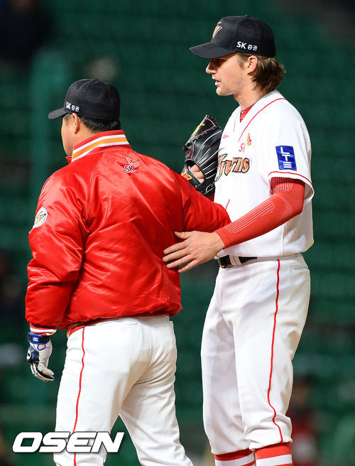 9일 오후 인천 문학구장에서 열린 '2013 한국야쿠르트 세븐 프로야구' SK 와이번스와 넥센 히어로즈의 경기 8회초 2사 1루 SK 이만수 감독이 마운드에 올라 세든 선발투수를 격려하고 있다