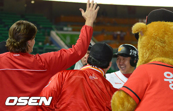 9일 오후 인천 문학구장에서 열린 '2013 한국야쿠르트 세븐 프로야구' SK 와이번스와 넥센 히어로즈의 경기 8회말 2사 SK 최정이 솔로홈런을 날리고 동료들의 축하를 받고 있다