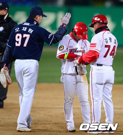 9일 오후 광주 무등경기장에서 '2013 한국야쿠르트 세븐 프로야구' KIA 타이거즈 대 두산 베어스의 경기가 열렸다. 5회말 KIA 공격 1사 주자없는 상황에서 2루타를 날린 2번 김선빈에게 두산 1루수 오재원이 머리를 툭치는 장난을 치고 있다.