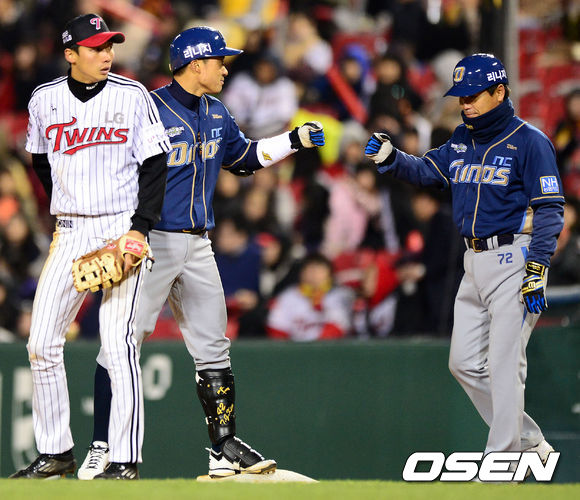 9일 오후 서울 잠실야구장에서 열린 2013 한국야쿠르트 세븐프로야구 LG 트윈스와 NC 다이노스의 경기, 6회초 무사 1,3루에서 NC 김태군이 좌전 적시타를 치고 환호하고 있다.