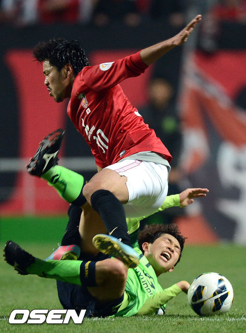 전북 이승기가 우라와 선수와 충돌해 중심을 잃고 넘어지고 있다. / youngrae@osen.co.kr