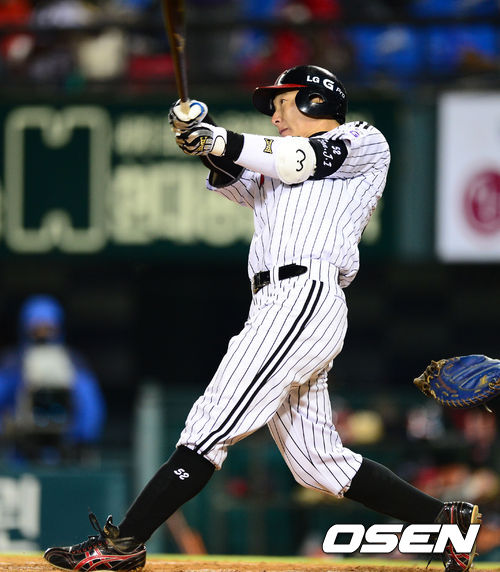 9일 오후 서울 잠실야구장에서 열린 2013 한국야쿠르트 세븐프로야구 LG 트윈스와 NC 다이노스의 경기, 7회말 1사 2,3루에서 LG 손주인이 좌전 적시타를 치고 있다.