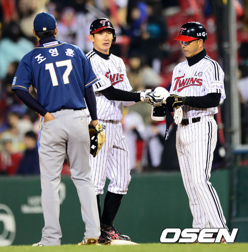 9일 오후 서울 잠실야구장에서 열린 2013 한국야쿠르트 세븐프로야구 LG 트윈스와 NC 다이노스의 경기, 7회말 1사 2,3루에서 LG 손주인이 좌전 적시타를 치고 타임을 외치고 있다.