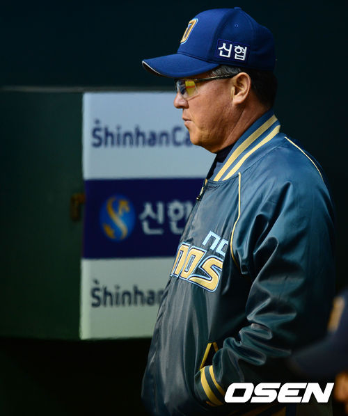 9일 오후 서울 잠실야구장에서 열린 2013 한국야쿠르트 세븐프로야구 LG 트윈스와 NC 다이노스의 경기, 8회말 NC 김경문 감독이 덕아웃에서 경기를 바라보고 있다.