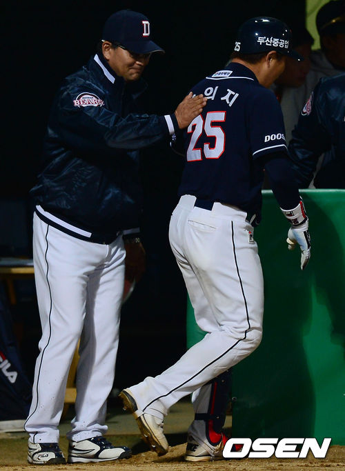 9일 오후 광주 무등경기장에서 '2013 한국야쿠르트 세븐 프로야구' KIA 타이거즈 대 두산 베어스의 경기가 열렸다. 8회초 두산 공격 선두타자로 나선 양의지가 솔로포를 터트린 뒤 김진욱 감독과 인사를 나누고 있다.