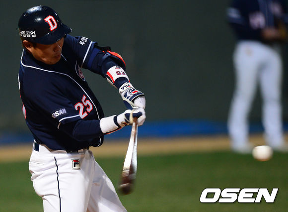 9일 오후 광주 무등경기장에서 '2013 한국야쿠르트 세븐 프로야구' KIA 타이거즈 대 두산 베어스의 경기가 열렸다. 8회초 두산 공격 2사 2루 상황 이번 이닝에 두번째 타석에 들어선 8번 양의지가 1타점 적시타를 날리고 있다.