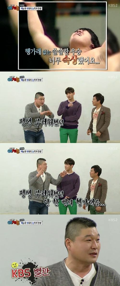 강호동은 9일 오후 방송된 KBS 2TV 새 예능프로그램 ‘우리동네 예체능’에서 일반인 신청자들과의 대결에 이길 경우 소원을 들어주겠다는 제작진의 말에 “씨름선수 출신인데 한 번도 헹가래를 받아본 적이 없다”며 “헹가래를 받고 싶다”고 말했다.