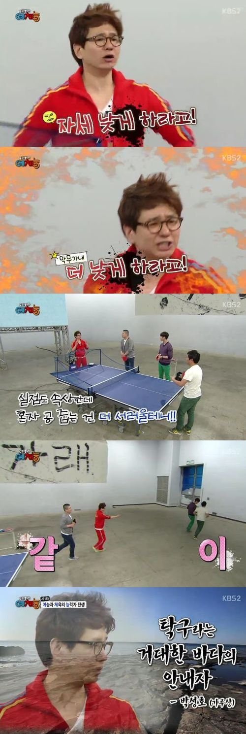 박성호는 연습에 열중하는 이수근에게 “더욱 자세를 낮춰야 한다”고 말하며 자신의 말에 따를 것을 요구했다. 이미 이수근은 자세를 낮추다 못해 탁구대에 머리만 내민 상태였지만 막무가내 강습은 그치지 않았다.