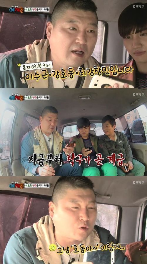강호동은 9일 오후 방송된 KBS 2TV 새 예능프로그램 ‘우리동네 예체능’에서 상도동 탁구동호회와 탁구 대결을 벌이게 됐다. 이를 위해 MC 강호동, 이수근, 최강창민 이외에도 4명의 멤버를 더 섭외해야 하는 상황에 놓였다.