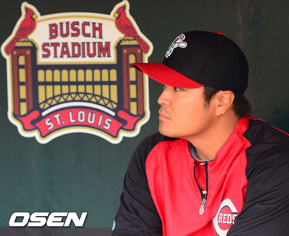 10일 오전(이하 한국시간) 미국 미주리주 세인트루이스 부시스타디움에서 '2013 메이저리그' 세인트루이스 카디널스과 신시내티 레즈의 경기가 열릴 예정인 가운데 경기 전 신시내티 추신수가 덕아웃에서 세인트루이스 선수들의 타격연습을 지켜보고 있다.
