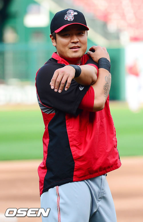 10일 오전(이하 한국시간) 미국 미주리주 세인트루이스 부시스타디움에서 '2013 메이저리그' 세인트루이스 카디널스과 신시내티 레즈의 경기가 열릴 예정인 가운데 경기 전 신시내티 추신수가 몸을 풀고 있다.