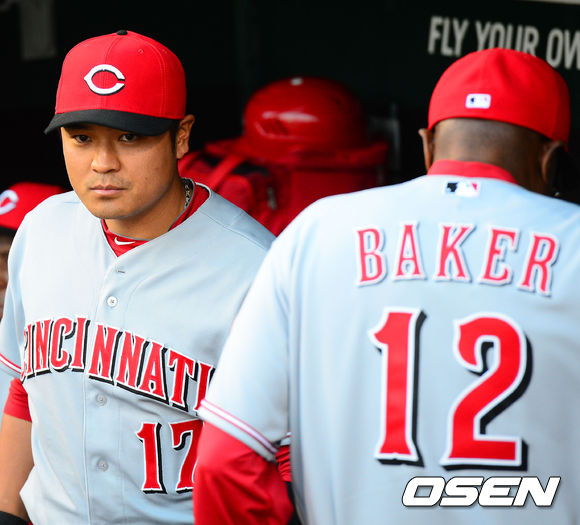 10일 오전(이하 한국시간) 미국 미주리주 세인트루이스 부시스타디움에서 '2013 메이저리그' 세인트루이스 카디널스과 신시내티 레즈의 경기가 열릴 예정인 가운데 경기 전 신시내티 추신수가 덕아웃에서 더스티 베이커 감독과 얘기를 나눈 후 덕아웃 밖으로 나가고 있다.