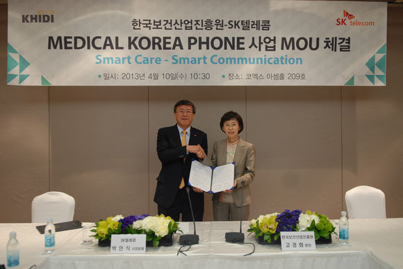 이를 위해 양측은 코엑스에서 열리고 있는 글로벌 헬스케어 컨퍼런스 '메디컬 코리아(MEDICAL KOREA) 2013'에서 박인식 SK텔레콤 사업총괄과 고경화 한국보건산업진흥원장이 참석한 가운데 '외국인 환자 유치사업 활성화를 위한 메디폰사업 MOU'를 10일 체결했다.