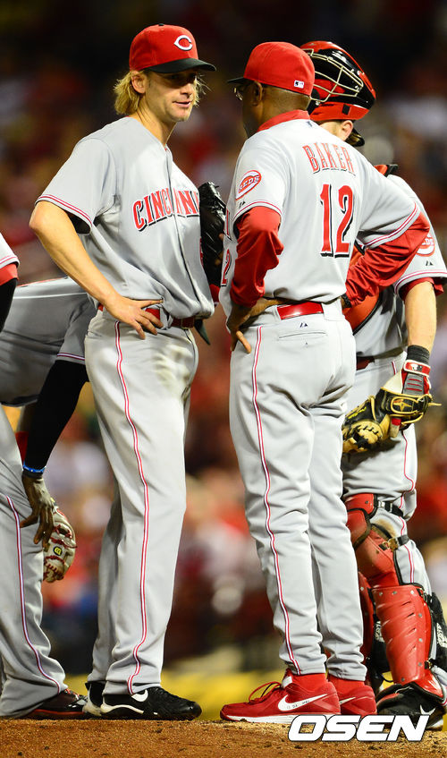 6회초 1사 주자 2,3루 신시내티 브론슨 아로요가 더스티 베이커 감독과 얘기를 나누고 있다.