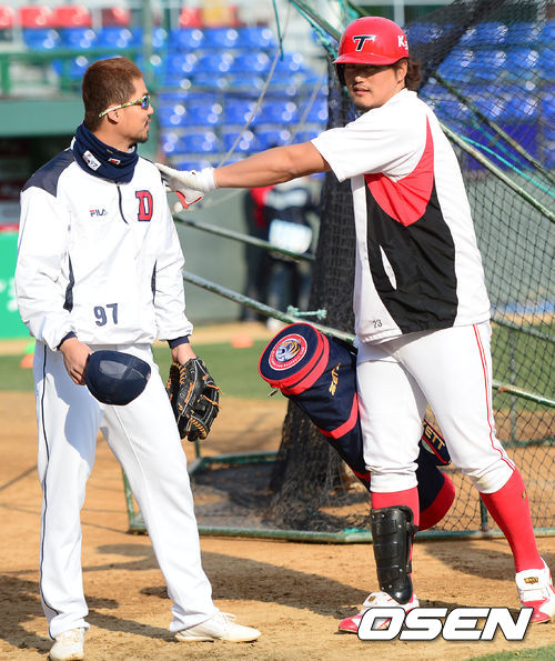 10일 오후 광주 무등경기장에서 열리는 '2013 한국야쿠르트 세븐 프로야구 KIA 타이거즈 대 두산 베어스의 경기를 앞두고 KIA 최희섭과 두산 오재원이 대화를 나누고 있다.