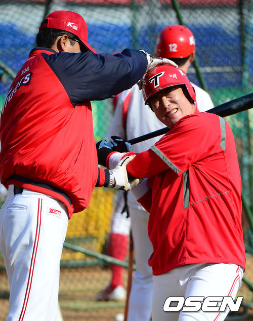 10일 오후 광주 무등경기장에서 열리는 '2013 한국야쿠르트 세븐 프로야구 KIA 타이거즈 대 두산 베어스의 경기를 앞두고 KIA 김용달 코치가 나지완에게 타격 자세를 지도하고 있다.