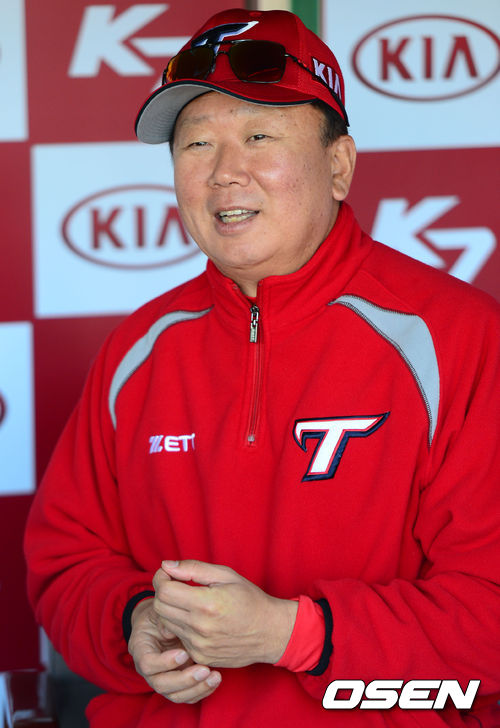 10일 오후 광주 무등경기장에서 열리는 '2013 한국야쿠르트 세븐 프로야구 KIA 타이거즈 대 두산 베어스의 경기를 앞두고 KIA 선동렬 감독이 취재진과 대화를 나누고 있다.