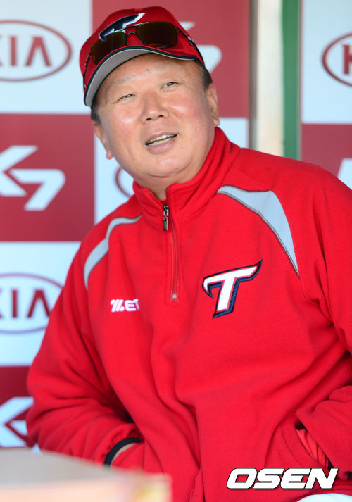 10일 오후 광주 무등경기장에서 열리는 '2013 한국야쿠르트 세븐 프로야구 KIA 타이거즈 대 두산 베어스의 경기를 앞두고 KIA 선동렬 감독이 취재진과 대화를 나누고 있다.