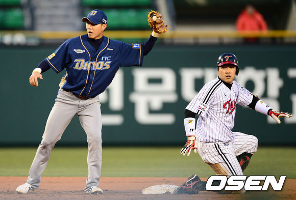 10일 오후 서울 잠실야구장에서 열린 2013 한국야쿠르트 세븐프로야구 LG 트윈스와 NC 다이노스의 경기, 2회말 만루에서 LG 조윤준이 2타점 적시타를 치고 2루에서 세이프되고 있다.