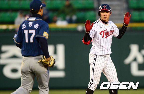 10일 오후 서울 잠실야구장에서 열린 2013 한국야쿠르트 세븐프로야구 LG 트윈스와 NC 다이노스의 경기, 2회말 2사 2,3루에서 LG 오지환이 중전 2타점 적시타를 치고 타임을 외치고 있다.