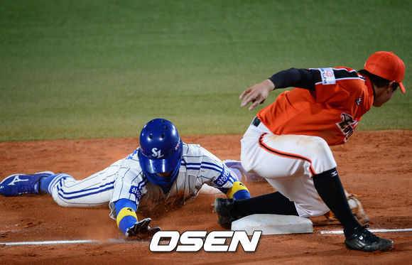 10일 오후 대구구장에서 열린 '2013 한국야쿠르트 세븐 프로야구' 삼성 라이온즈와 한화이글스 경기 3회말 1사 김상수 타석때 2루 주자 조동찬 3루 기습도루 세이프 되고 있다.