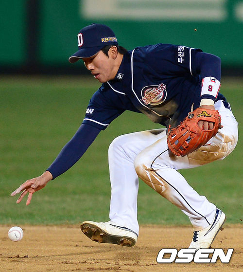 10일 오후 광주 무등경기장에서 '2013 한국야쿠르트 세븐 프로야구' KIA 타이거즈 대 두산 베어스의 경기가 열렸다. 3회말 KIA 공격 1사 주자 없는 상황, 두산 유격수 허경민이 9번 안치홍의 땅볼 타구를 놓치고 있다.