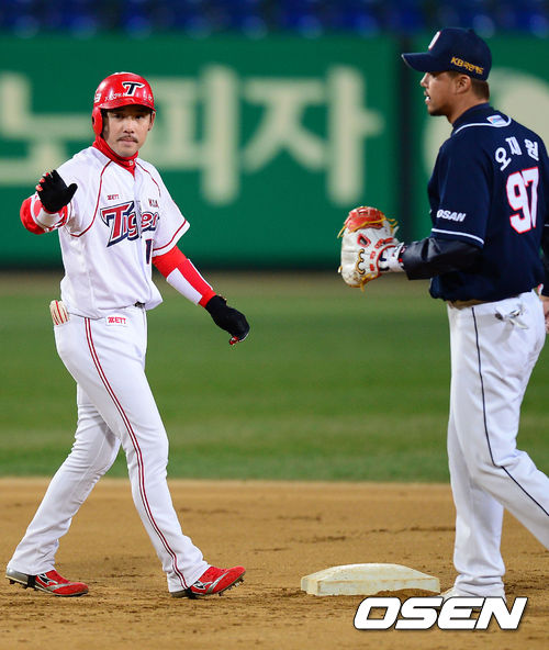 10일 오후 광주 무등경기장에서 '2013 한국야쿠르트 세븐 프로야구' KIA 타이거즈 대 두산 베어스의 경기가 열렸다. 3회말 KIA 공격 1사 1루 상황 1번 이용규가 1타점 동점 2루타를 날리고 타임을 요청하고 있다.